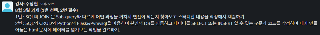 SQL의 CRUD와 Python의 Flask&Pymysql을 이용하여 본인의 DB를 연동하고 데이터를 SELECT 또는 INSERT 할 수 있는 구문과 코드를 작성하여 내가 만들어놓은 html 문서에 데이터를 넘겨보는 작업을 완료하기.