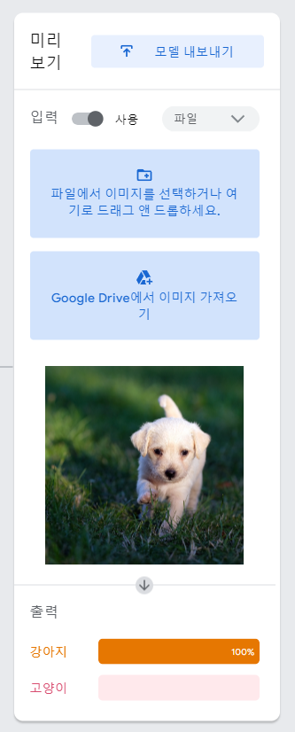 이미지 업로드 후 [모델 학습시키기] 버튼 클릭 후 테스트 이미지로 확인 가능
