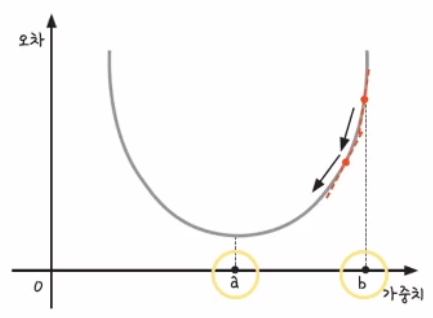 - 오차를 줄이려면 가장 오차가 작은 지점으로 가중치를 이동해야 함