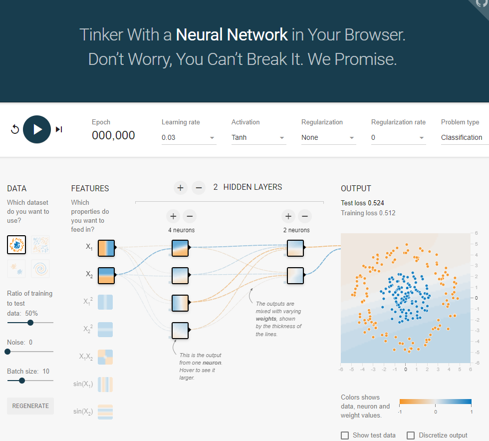 텐서플로 플레이그라운드에서는 ReLU, tanh, Sigmoid, Linear 함수를 사용할 수 있다 - Regularization: 정규화를 의미합니다