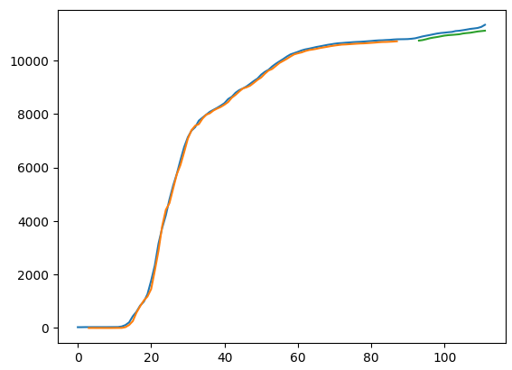 - 그렇기 때문에 실제 데이터의 그래프와 훈련데이터를 예측한 그래프, 검증 데이터를 예측한 그래프를 한 번에 그려서 비교해 봄