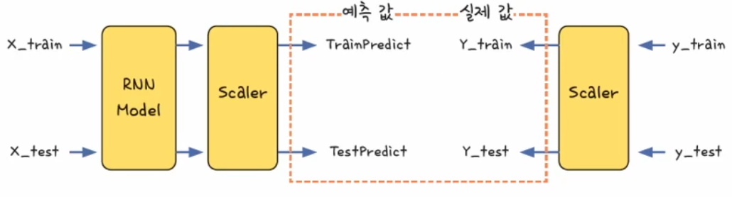 RNN 모델을 통해 나온 예측 값을 정규화되지 전의 값으로 변환하여야 하며 실제 값 또는 정규화되기전의 값으로 변환