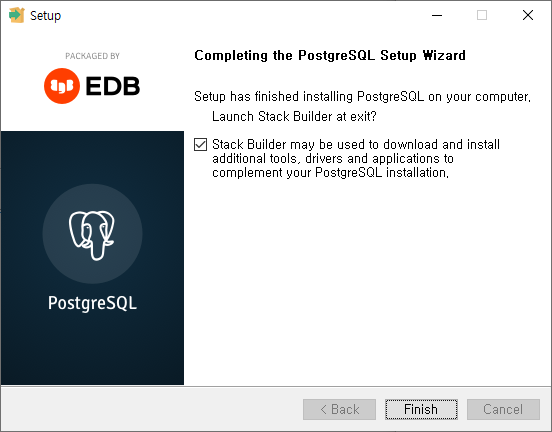 - Stack Builder : PostgreSQL에 에드온을 쉽게 설치하고 관리할 수 있게 하는 유틸리티