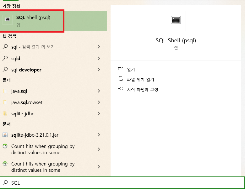 SQL를 검색하고 SQL Shell (psql) 를 실행