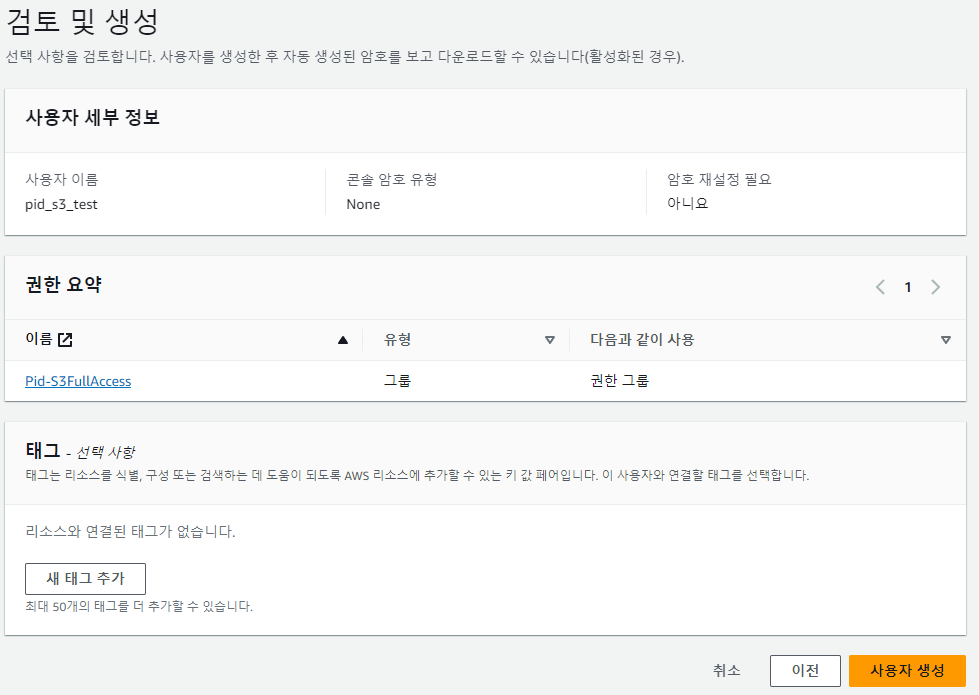 그룹에 사용자 추가, 사용자 그룹에서 방금 만든 Pid-S3FullAccess 그룹을 체크 하고 넘어간다.