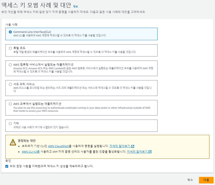 Command Line Interface(CLI) 를 체크하고 아래 동의 체크에도 체크 후 다음으로 넘어간다.
