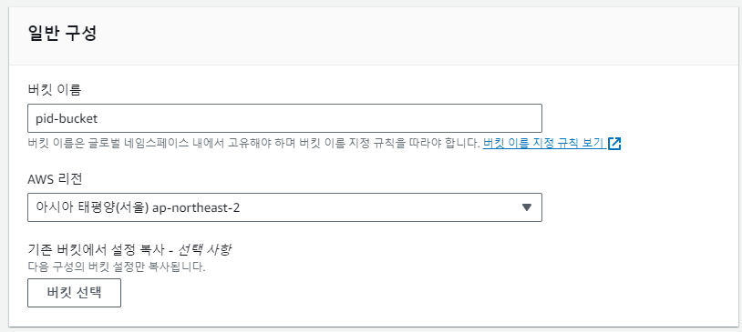 버킷 이름을 pid-bucket 으로 해주고 지역을 서울로 한다.