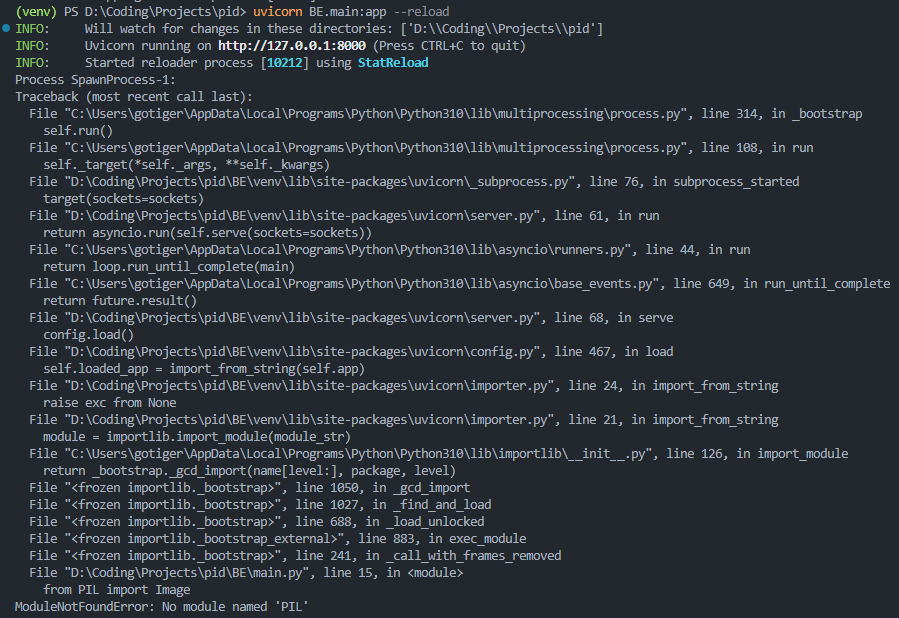 최근에 팀원분의 기능이 병합이 되고 풀받은 상태에서 추가된 라이브러리 설치안함..