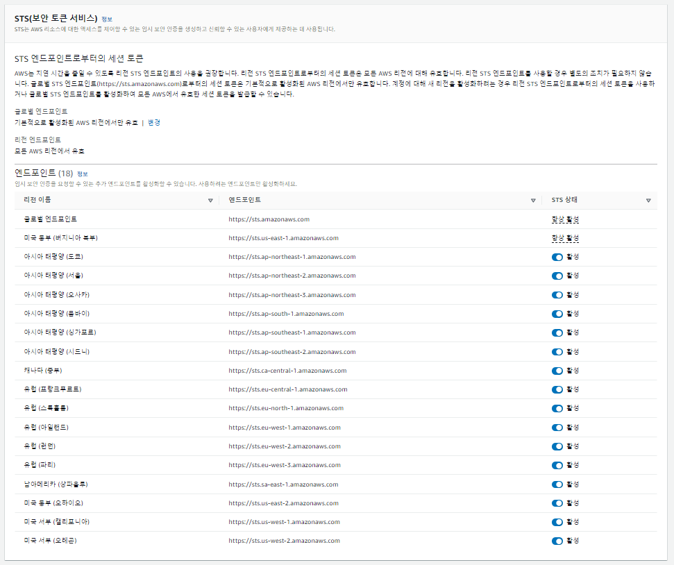 스크롤을 내려보면 아래 STS(보안 토큰 서비스)가 보입니다.