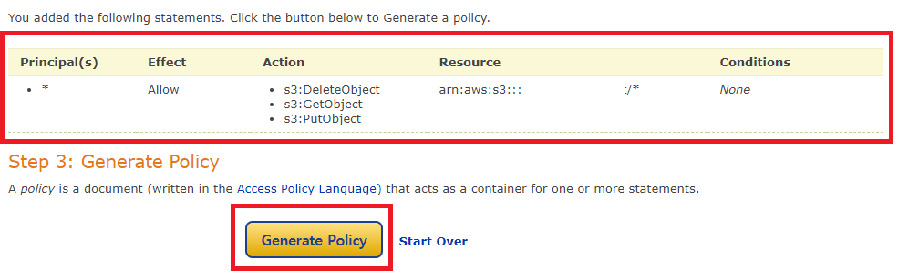 Amazon Resource Name (ARN) 에는 아까 복사한 버킷 ARN + /* 를 붙여준다.