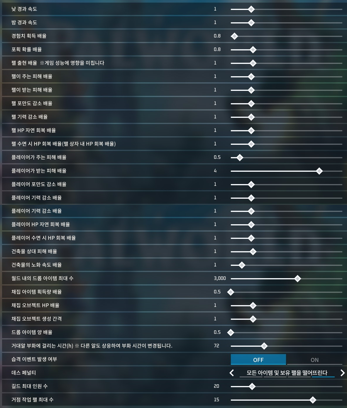 - 모든 아이템을 떨어뜨린다 (보유 팰 제외)